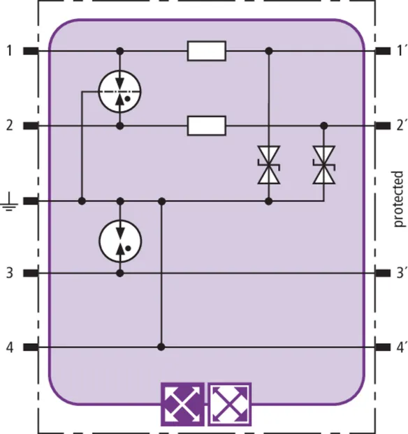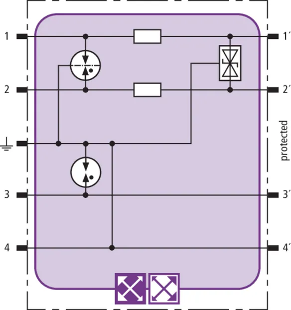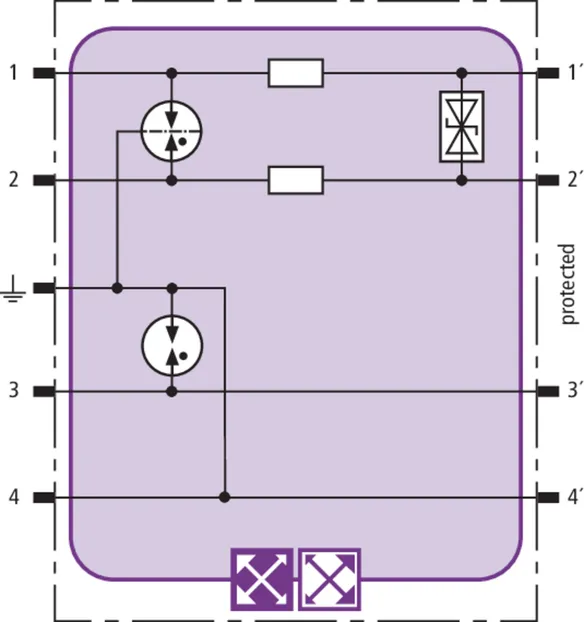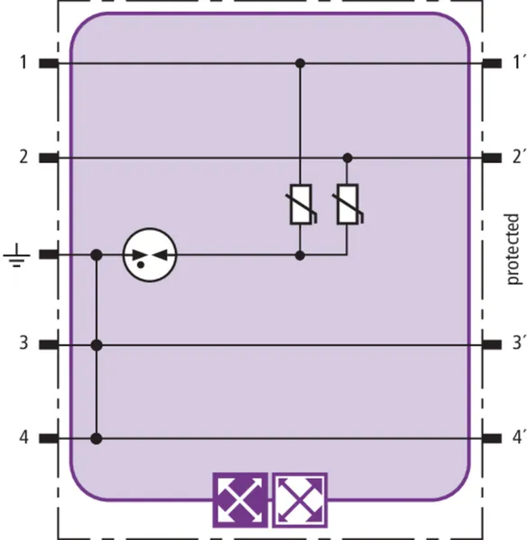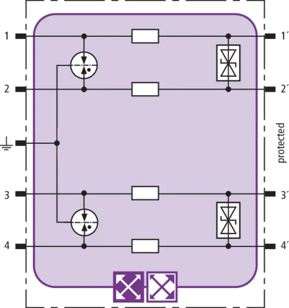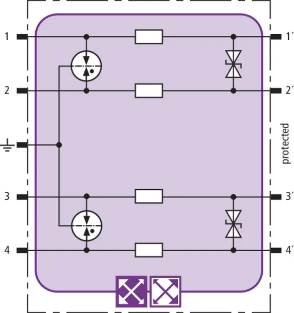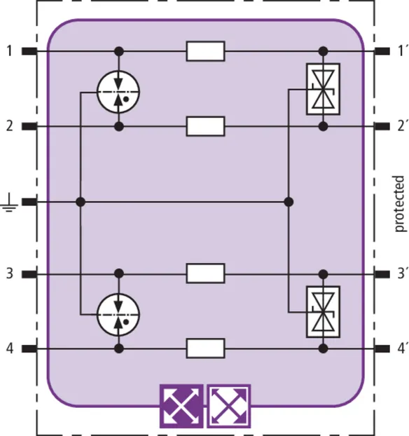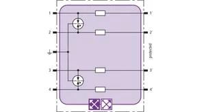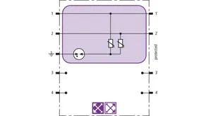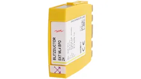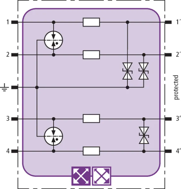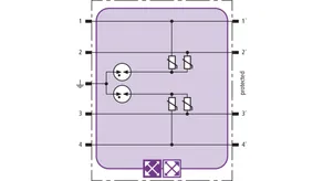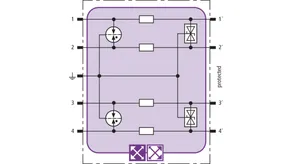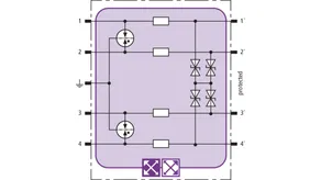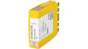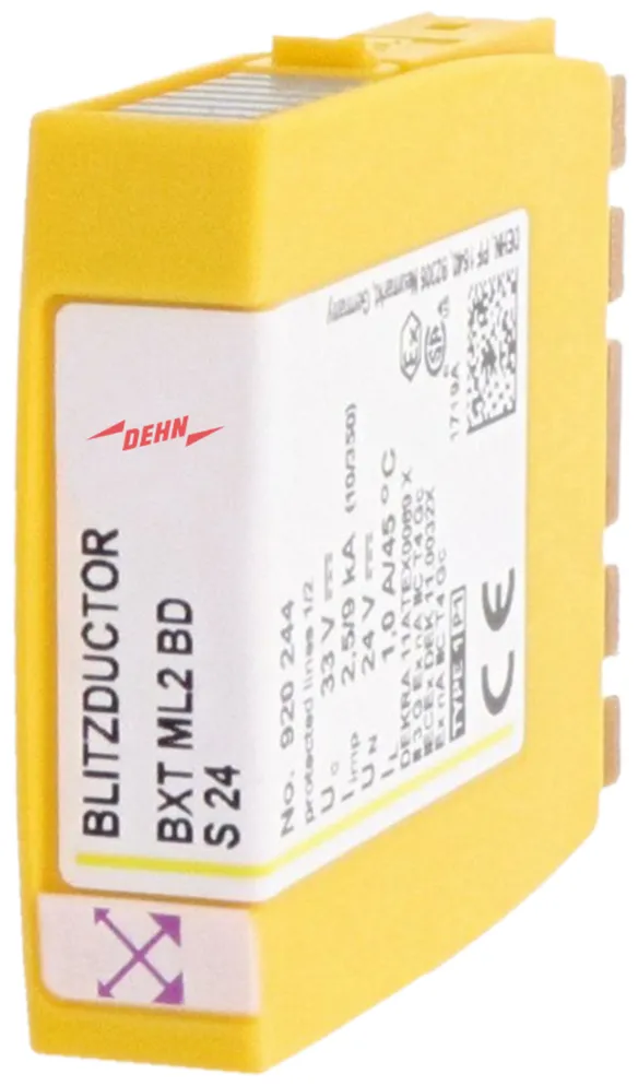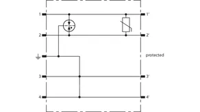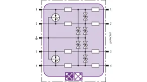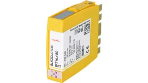 Space-saving combined arrester module with RFID LifeCheck for protecting two pairs in 24 V d.c. systems. Can also be used for systems with earthed negative poles. Integrated PTC resistors allow to reliably reset the arrester after the system circuit has been affected by short-circuit currents up to 40 A.