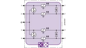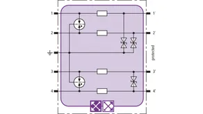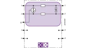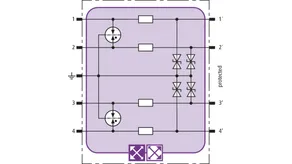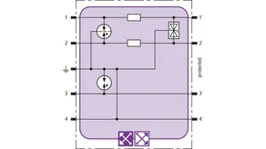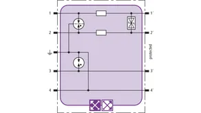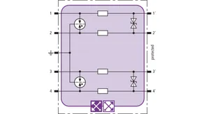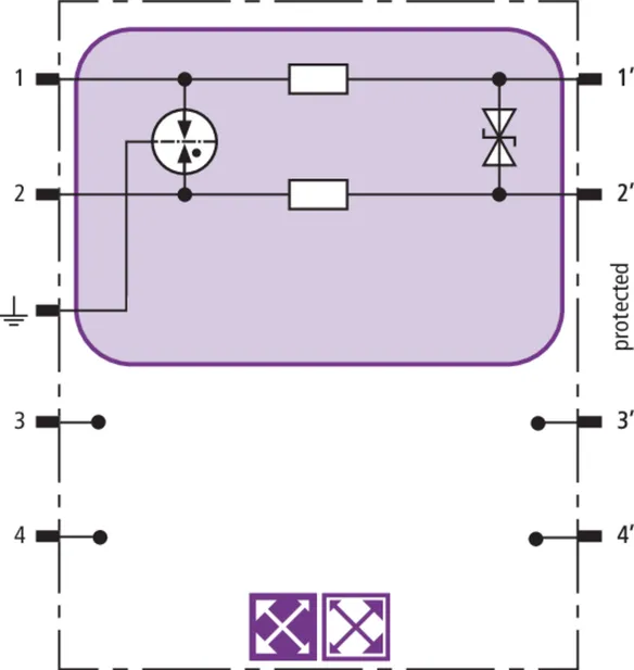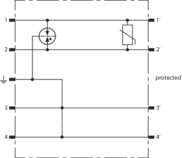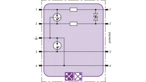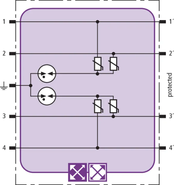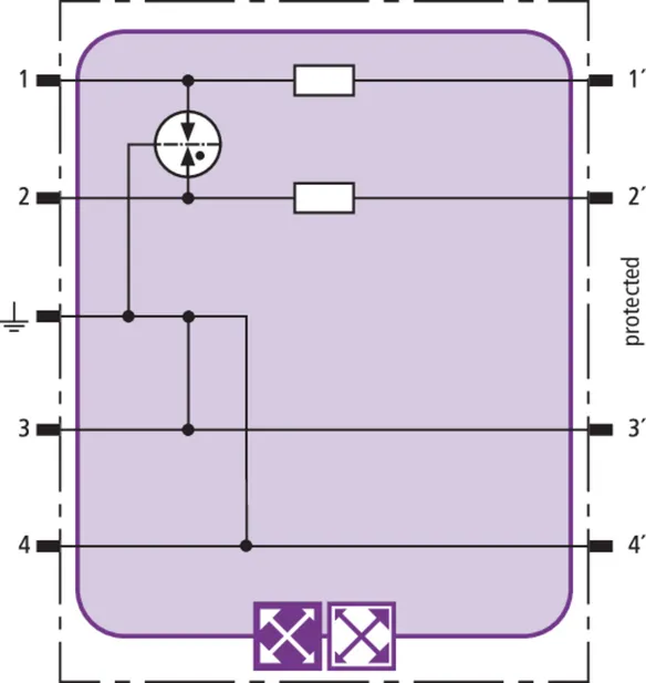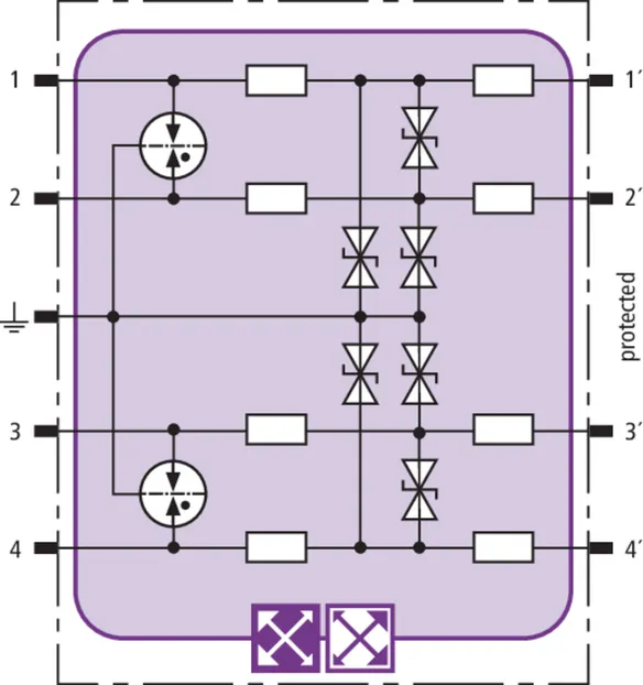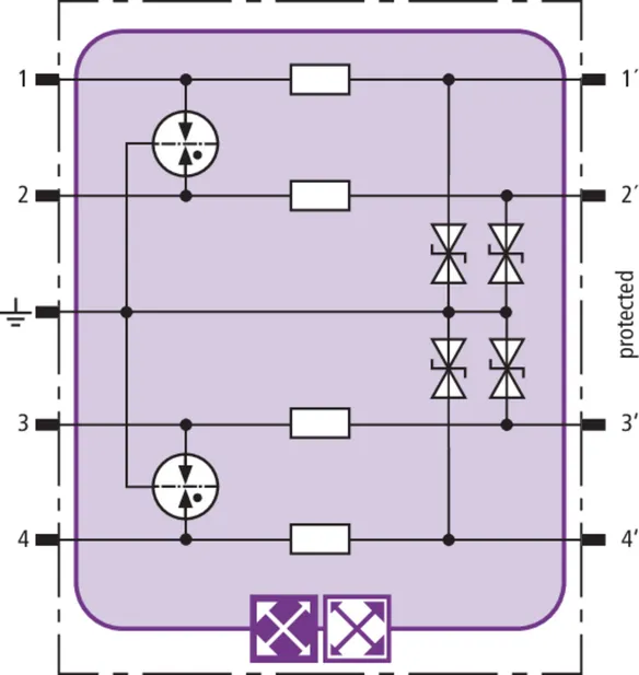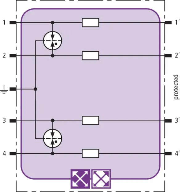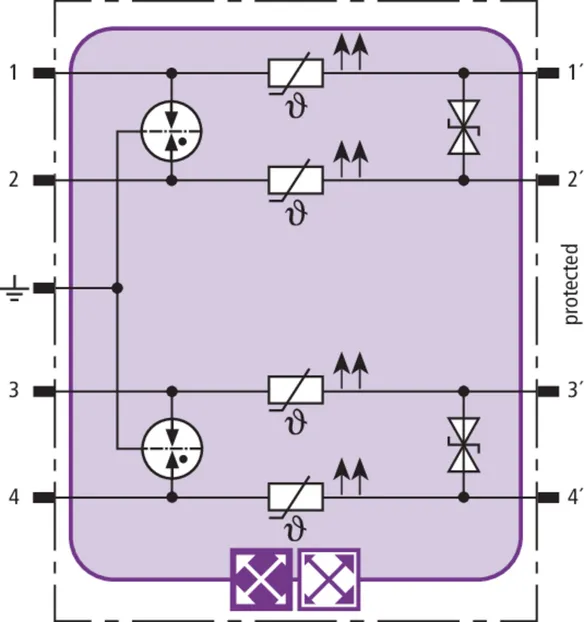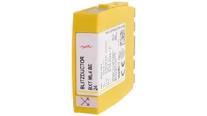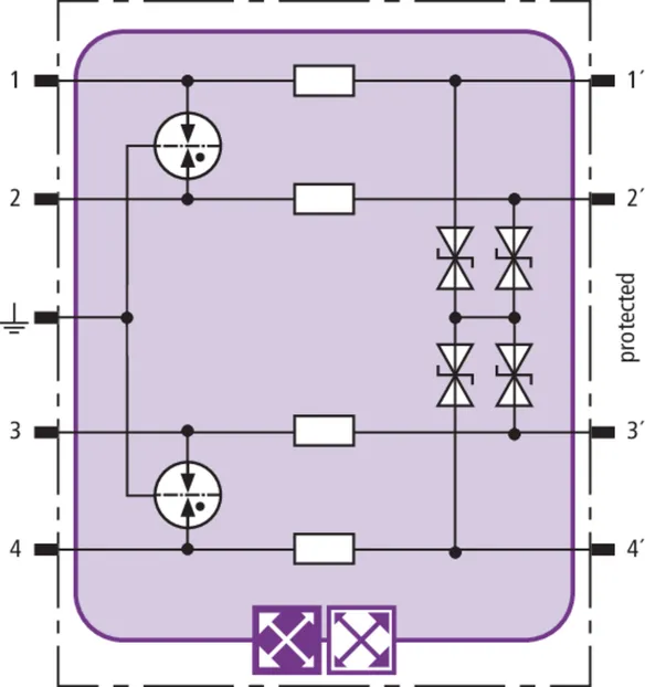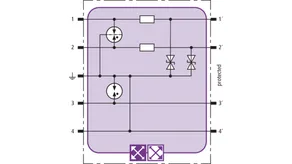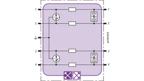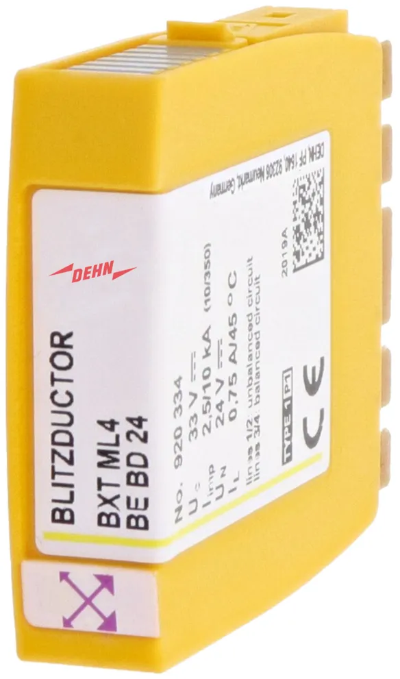 Space-saving combined arrester module with RFID LifeCheck for protecting two pairs in 24 V d.c. systems. Can also be used for systems with earthed negative poles. Integrated PTC resistors allow to reliably reset the arrester after the system circuit has been affected by short-circuit currents up to 40 A.