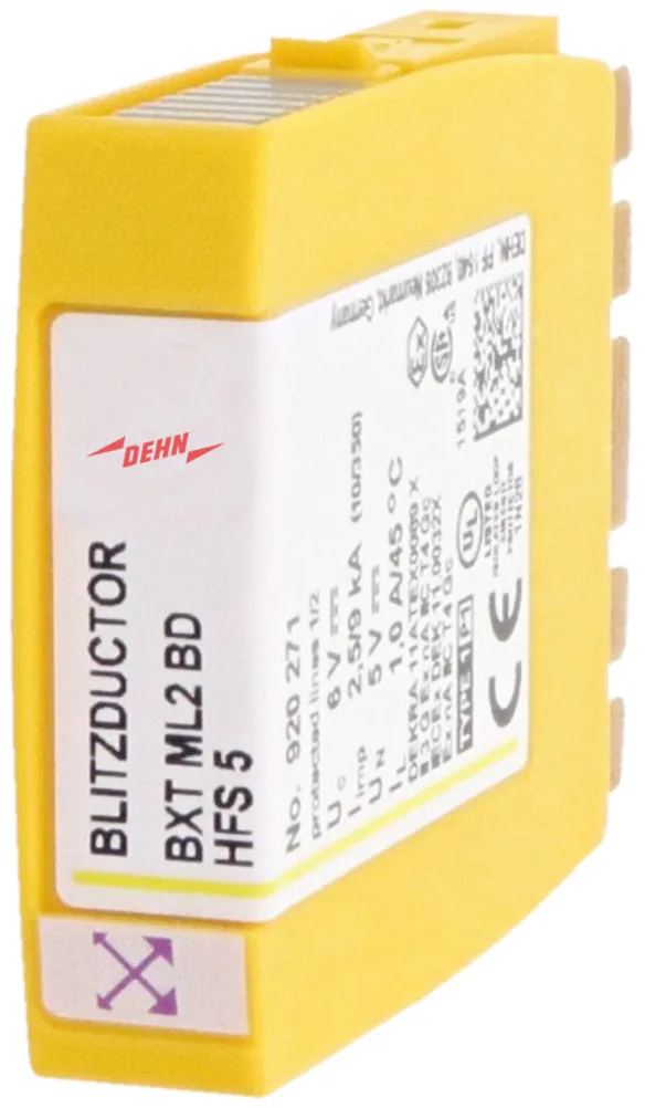 Space-saving combined lightning current and surge arrester module with RFID LifeCheck for protecting one pair of high-frequency transmissions without galvanic isolation, with direct or indirect shield earthing. If LifeCheck detects thermal or electrical overload, the arrester has to be replaced. This status is indicated contactlessly by the DEHNrecord LC / SCM / MCM reader.