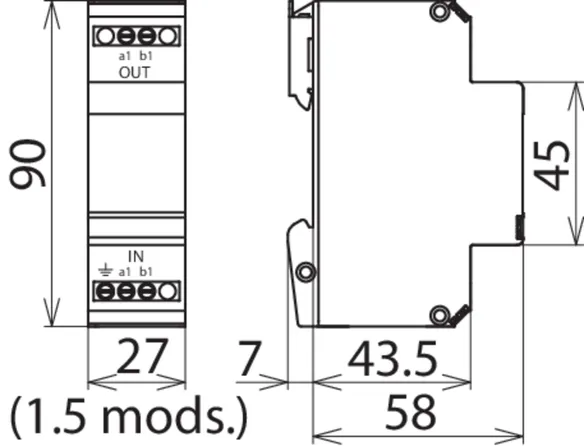 Energy-coordinated and leakage-current-free surge arrester for a/b lines, ISDN Uk0 or ADSL with RJ45 connections and additional screw terminals. Pinning of the RJ45 sockets is compatible with RJ11/12. The parallel screw terminals are more robust than the RJ45 sockets and increase the total nominal discharge current to 10 kA.