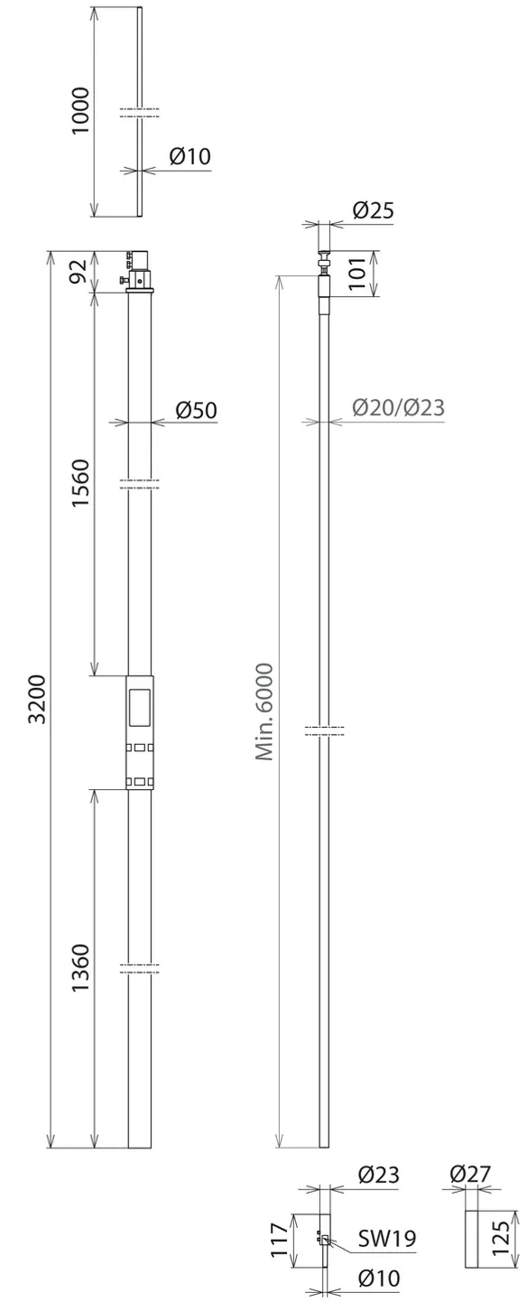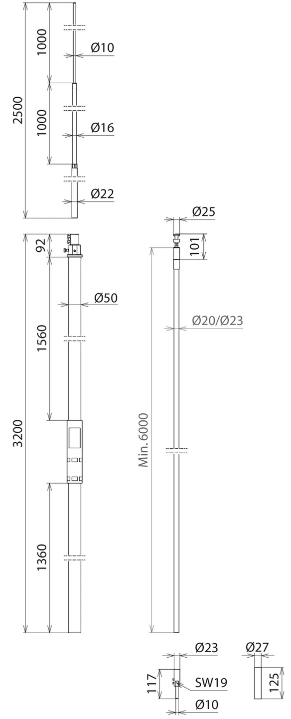 | Max. free length with air-termination rod (wall mounting) | 5500 mm |