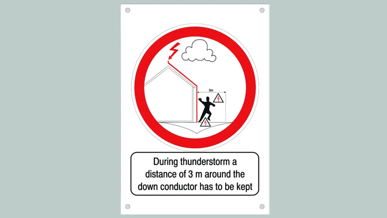 During thunderstorm a distance of 3 m around the down conductor has to be kept!