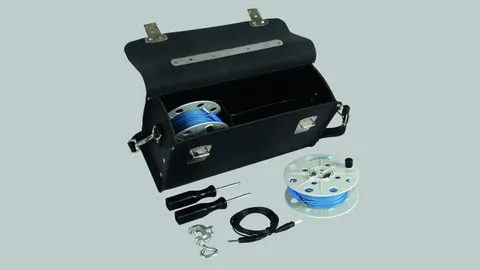 • 2 coilers with unwinding handle and 50 m measuring line, blue, with banana pin, Part No. 585 320