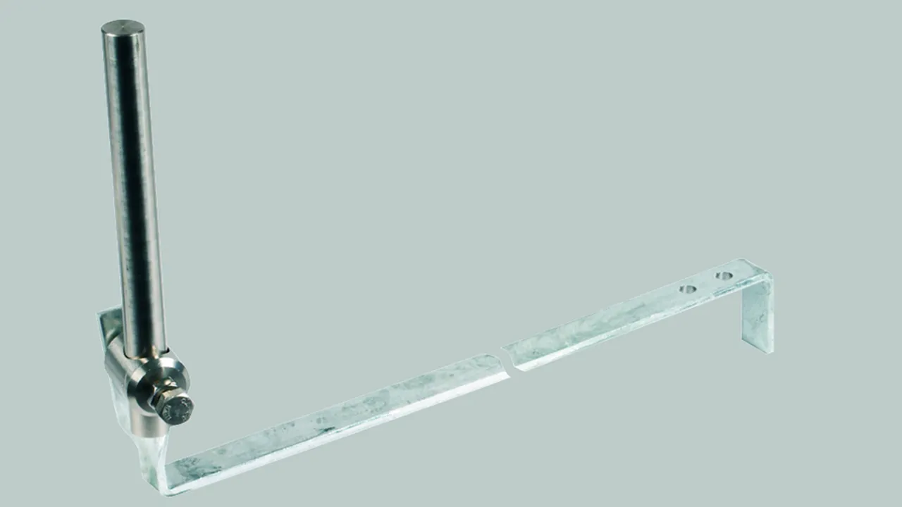 Rod holder for gable roofs Rod holder for gable roofs as footing for fixing air-termination rods on gable roofs with rotation locking. Additional fixing of the air-termination rod, e.g. to the chimney with DEHNiso spacer is necessary