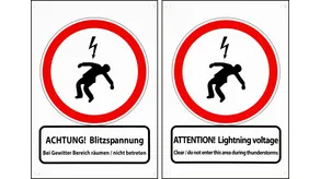 Plaque signalétique Attention Tension de foudre Plaque signalétique Impression en allemand au recto : « ACHTUNG! Blitzspannung Bei Gewitter Bereich räumen / nicht betreten » Impression en anglais au verso : « ATTENTION! Lightning voltage Clear / do not enter this area during thunderstorms »
