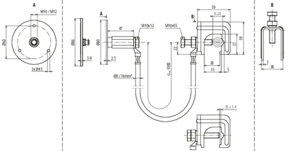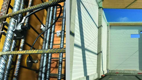 Jeu de pontage et de raccordement pour utiliser les barres d’armature (fers longitudinaux) de poteaux ou de murs en béton armé comme conducteurs de mise à la terre. En intégrant des barres d’armature continues dans les poteaux en béton armé, il n’est pas nécessaire d’installer des conducteurs ronds supplémentaires (en acier galvanisé) pour la protection contre la foudre / la mise à la terre / la liaison équipotentielle. La liaison électrique nécessaire s’effectue sur toute la longueur du poteau en béton armé, à l’aide d’une barre d’armature verticale.