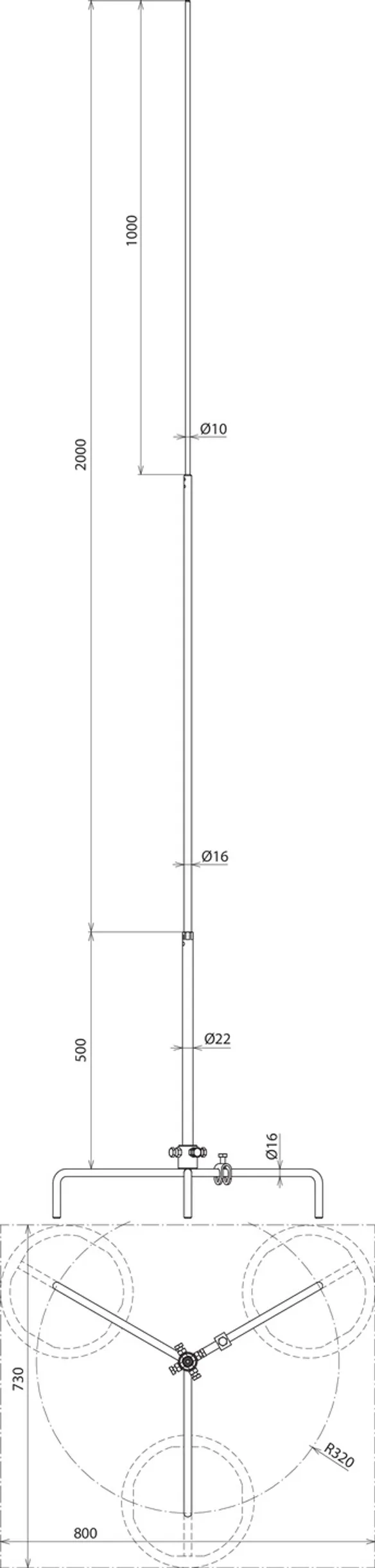 Encombrement du trépied - 3 plots à 8,5 kg: 730 x 800 mm