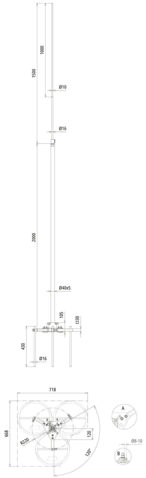Encombrement - trépied: 668 x 718 mm