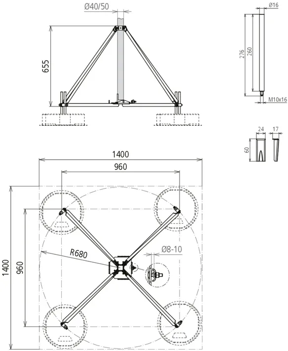 Pour les tiges de capture Ø40 mm ou les tubes supports Ø50 mm, longueur 3200 mm (par ex. références 105 440 ou 105 300), sans fixation supplémentaire aux éléments de construction.