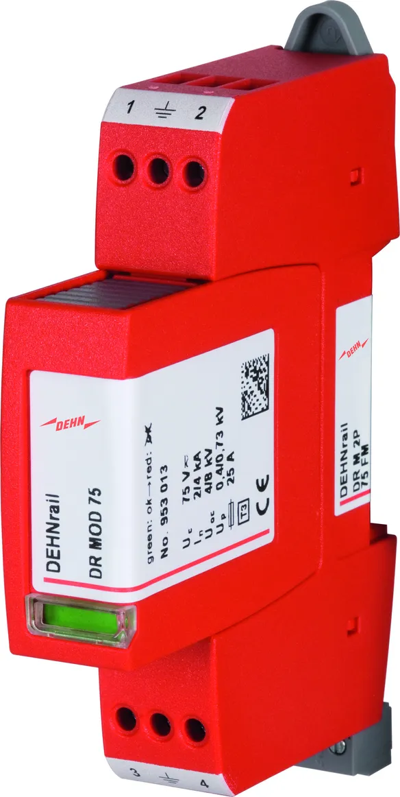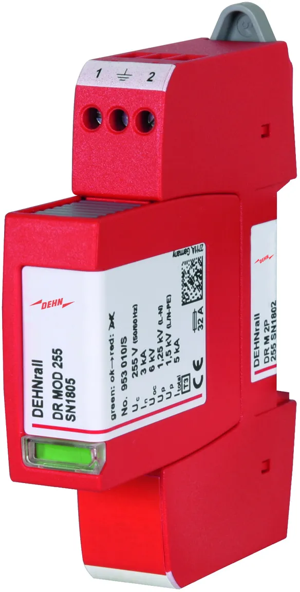 Parafoudre bipolaire comprenant une embase et un module de protection débrochable. Utilisation dans des systèmes jusqu'à un courant de charge de 32 A possible.