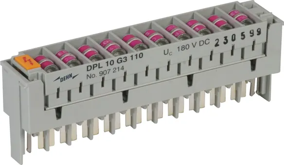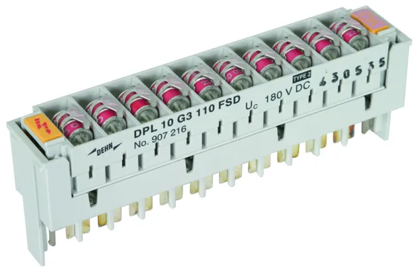 Protection enfichable à 10 paires avec éclateurs à gaz tripolaires conçus pour pratiquement toutes les applications. Les parafoudres FSD disposent d’une fonction « fail-safe » avec indication optique en cas de déclenchement du « fail-safe ». Il est ainsi possible de reconnaître instantanément si une protection doit être remplacée.