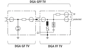 Les parafoudres DGA... TV sont des protections appropriées aux alimentations de systèmes de commande à distance et équipées d’un raccordement de type F pour installations SAT. Ces parafoudres sont disponibles en tant que parafoudre de type 1 combiné, parafoudre de type 1 coordonné et parafoudre de type 3 avec sortie de mesure intégrée pour le contrôle de l'installation.