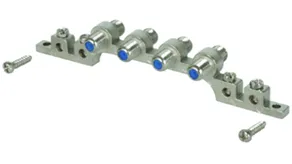 Bloc de mise à la terre à 4 accès avec prises F pour l'équilibrage de potentiel des blindages de câble SAT ou des parafoudres DGA GF TV.