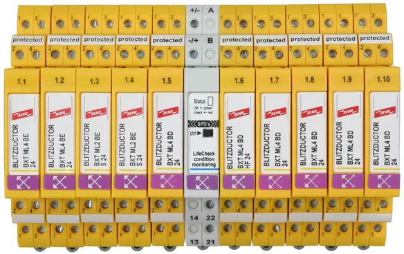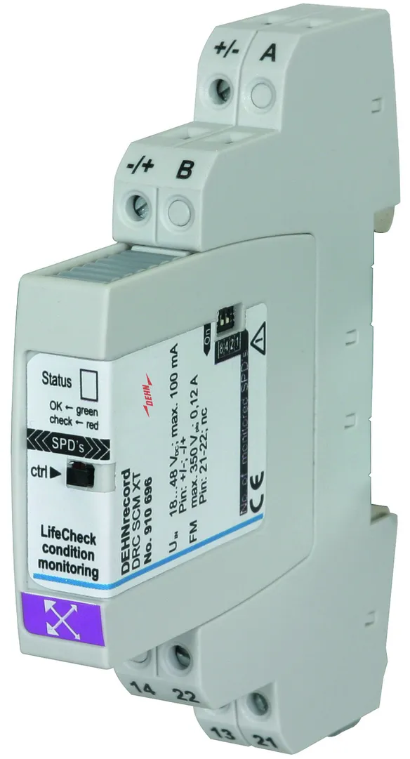 Le module de surveillance disposant de la technologie RFID-LifeCheck peut surveiller l’état de fonctionnement de 10 parafoudres BLITZDUCTOR XT/XTU. Indication optique tricolore et contact de télésignalisation (ouverture ou fermeture). L'interface RS485 intégrée permet de surveiller jusqu'à 15 DRC MCM XT dans un système comportant jusqu'à 150 parafoudres BLITZDUCTOR XT / XTU.