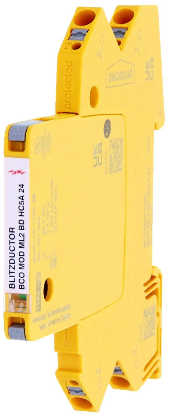 Parafoudre débrochable peu encombrant d'une largeur de 6 mm et technologie de connexion push-in avec indication d'état en façade. Protection d'une paire en 24V DC, également adaptées pour des signaux avec un référentiel négatif.