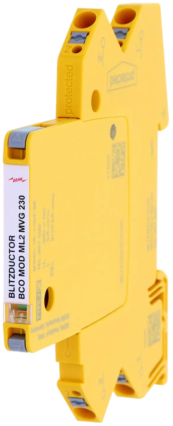 Parafoudre débrochable peu encombrant d'une largeur de 6 mm et technologie de connexion push-in avec indication d'état en façade. Protection de deux conducteurs partageant un potentiel de référence commun ou une interfaces asymétriques. Adapté à la haute fréquence.