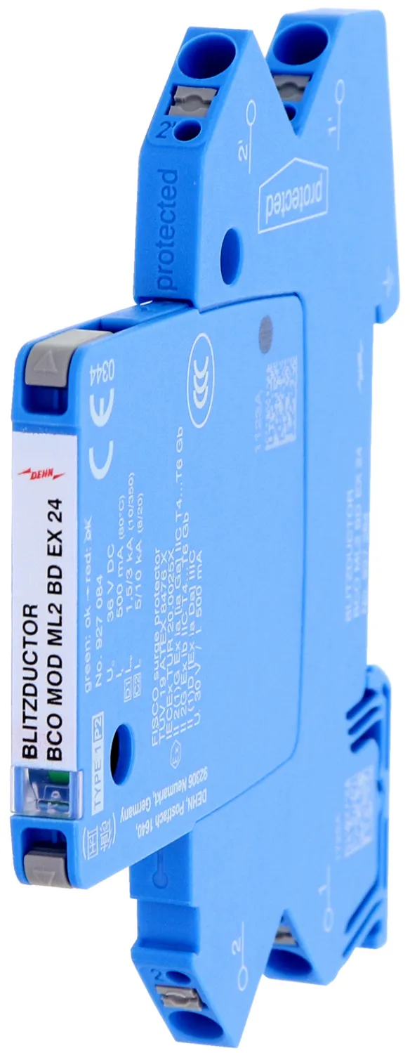 Parafoudre débrochable peu encombrant d'une largeur de 6 mm et technologie de connexion push-in avec indication d'état en façade. Protection de deux conducteurs de circuits de mesure et de systèmes de bus à sécurité intrinsèque, conforme aux exigences FISCO. Résistance d'isolement> 500 V mise à la terre. Avec déconnexion du signal à des fins de maintenance.