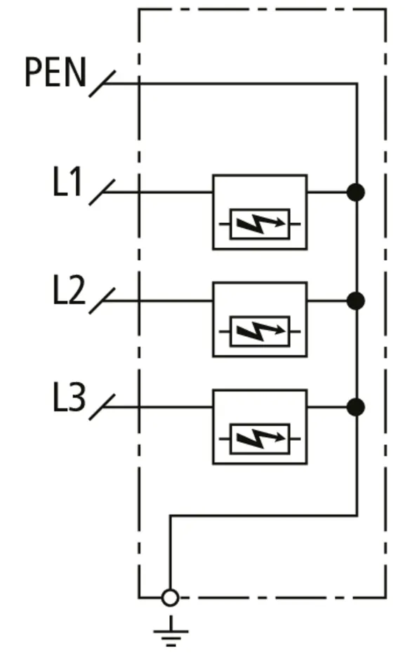 | Courant de choc de décharge (10/350 µs) [L1+L2+L3-PEN] (Itotal ) | 37,5 kA |