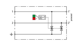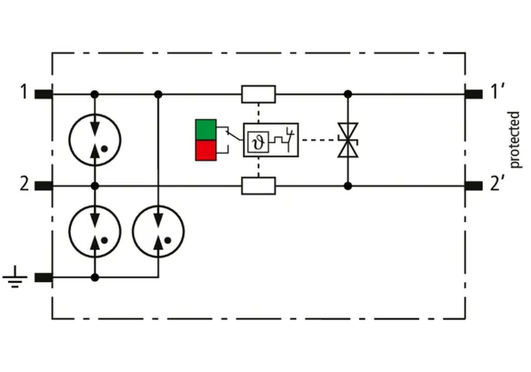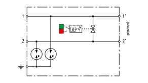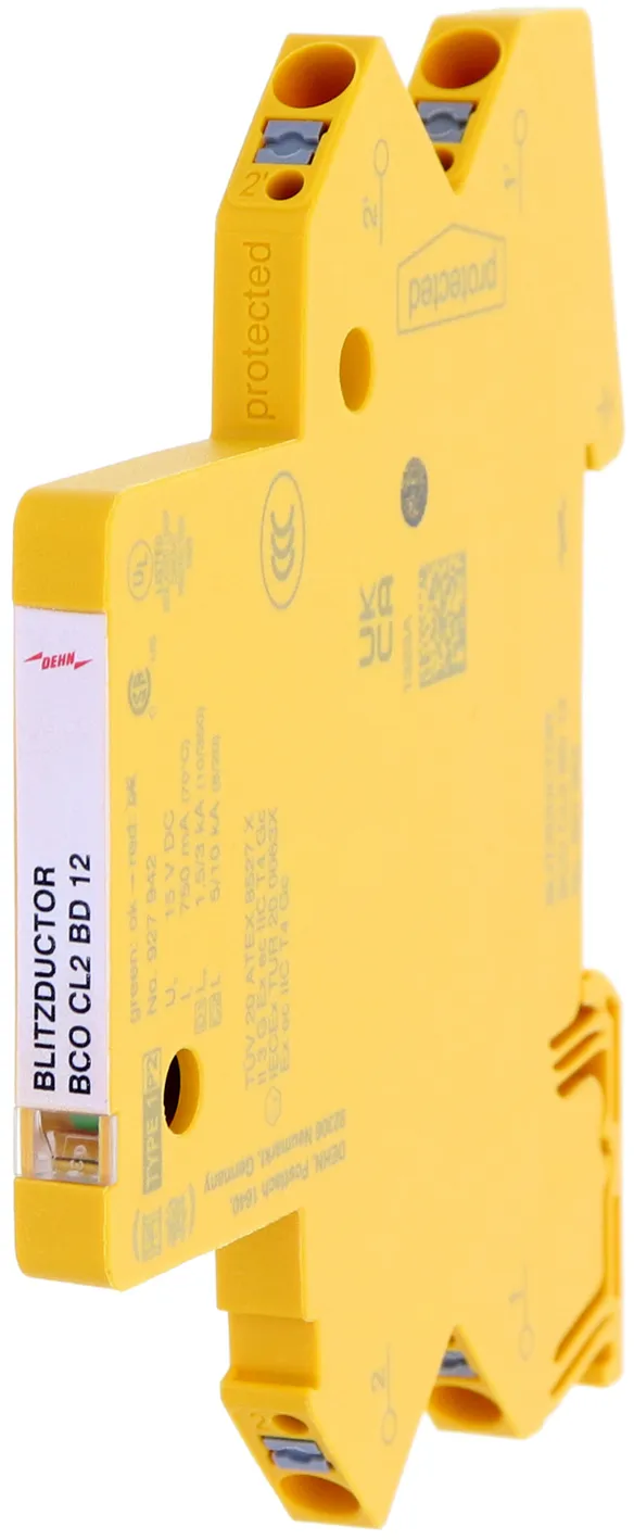 Parafoudre compact d'une largeur de 6 mm et technologie de connexion push-in avec indication d'état. Pour la protection d'une paire de circuits de mesure et de systèmes de bus à sécurité intrinsèque, conforme aux exigences FISCO. Résistance d'isolement >500 V mise à la terre.