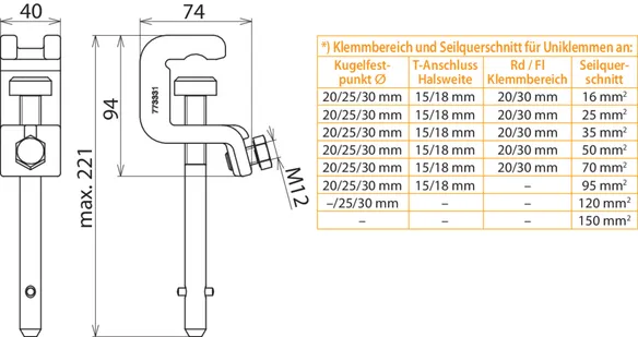 | *) voir tableau indiquant les plages de serrage et la section max. du câble pour les bornes universelles | |